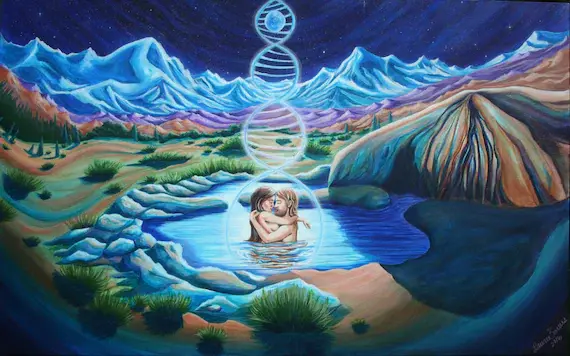 My inner dreams and visions come in different ways- something I'm needing to express within my spirit, something that has to come out of me and onto the canvas. Whether it's a declaration of love, of connection, of my own inner longing, the need to be more than what I am now, I really feel the most joy creating my inner soul song. My need to express myself and these deep inner visions come in dreamtime, plant medicine helpers and my own grief, contentment and blessings in life. I am so grateful that when I talk with people about my inner art that most everyone resonates that feeling back to me. I have had some amazing stories from people seeing my work that have the most profound experiences once they view my pieces. I am so humbled by this, and it really gives me a sense of awe at how the Universe works its magic through people I meet.